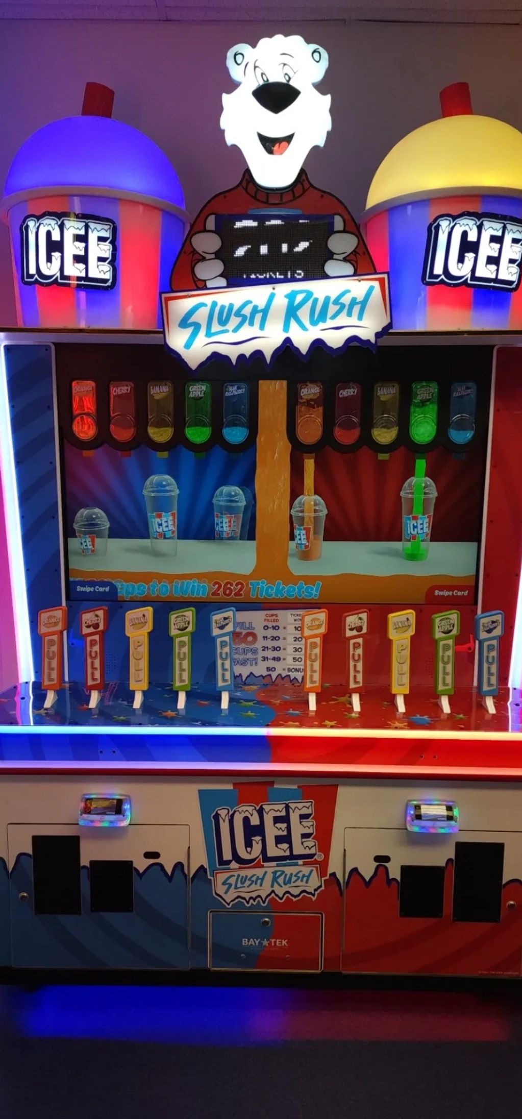 Get ready for a frosty good time with Slush Rush, the exciting arcade game that’s as refreshing as your favorite ICEE! Players take control of colorful flavor levers—Orange, Cherry, Banana, Green Apple, and Blue Raspberry—and race to fill up giant ICEE cups on screen. The more cups you fill, the more tickets you win!